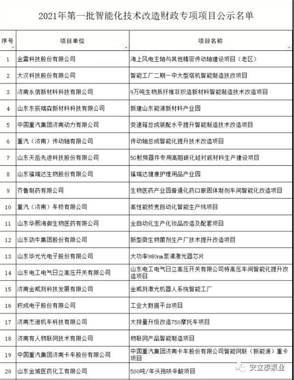 濟寧安泰礦山設備制造有限公司(簡稱安泰泵業)經企業申報、各市推薦、專家評審等環節,入選列入2021年第一批智能化技術改造財政專項項目名單,公示時間為2021年10月11日-15日(5個工作日)。